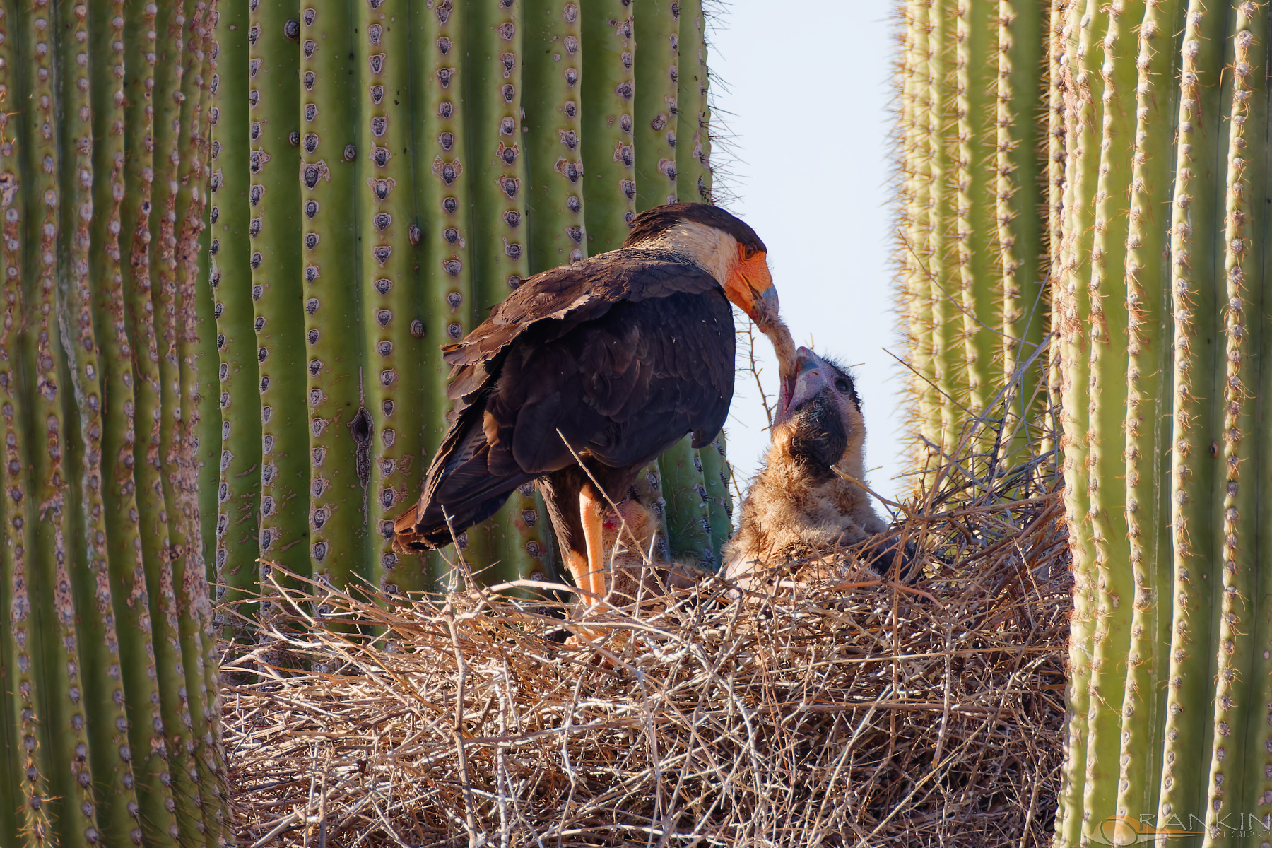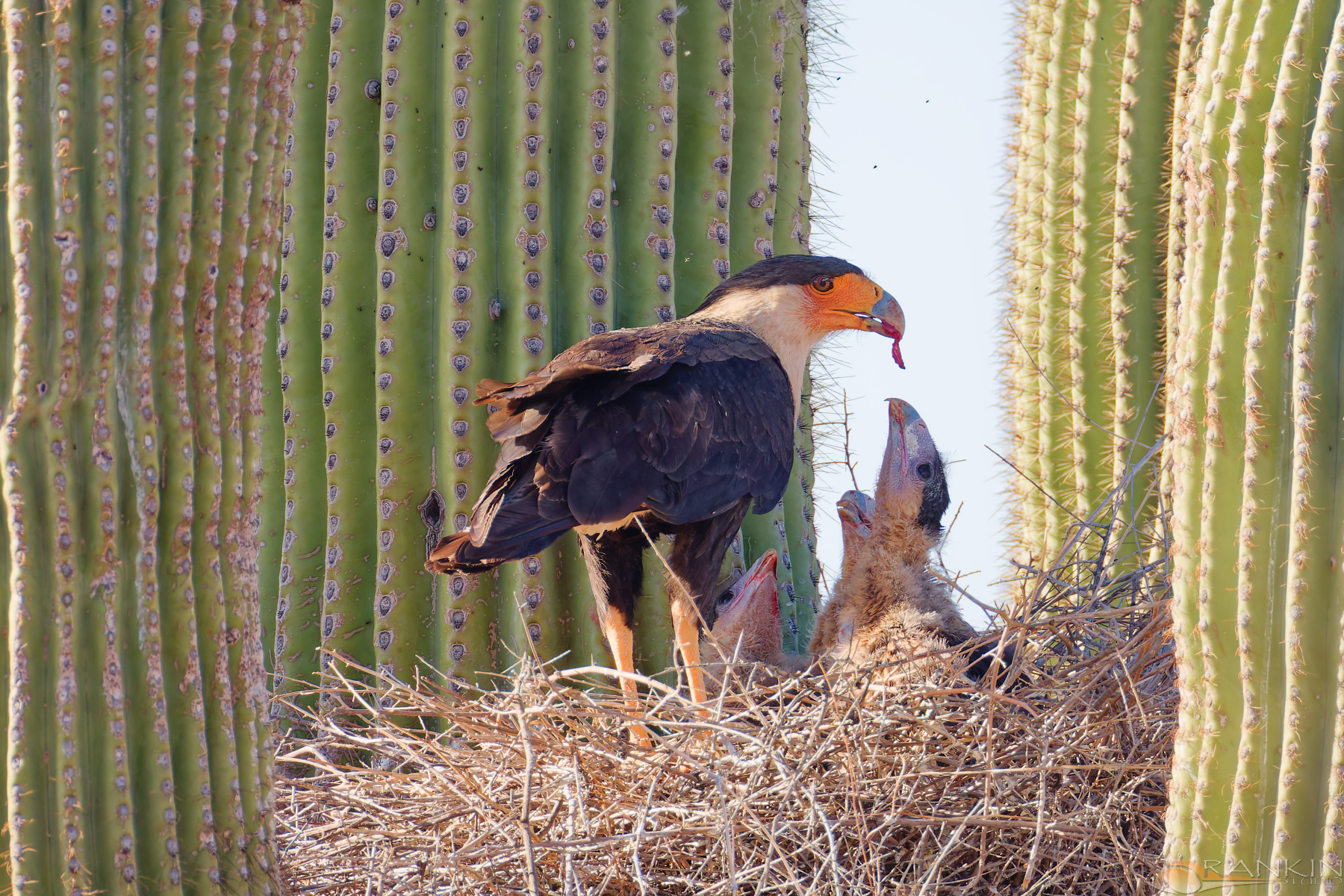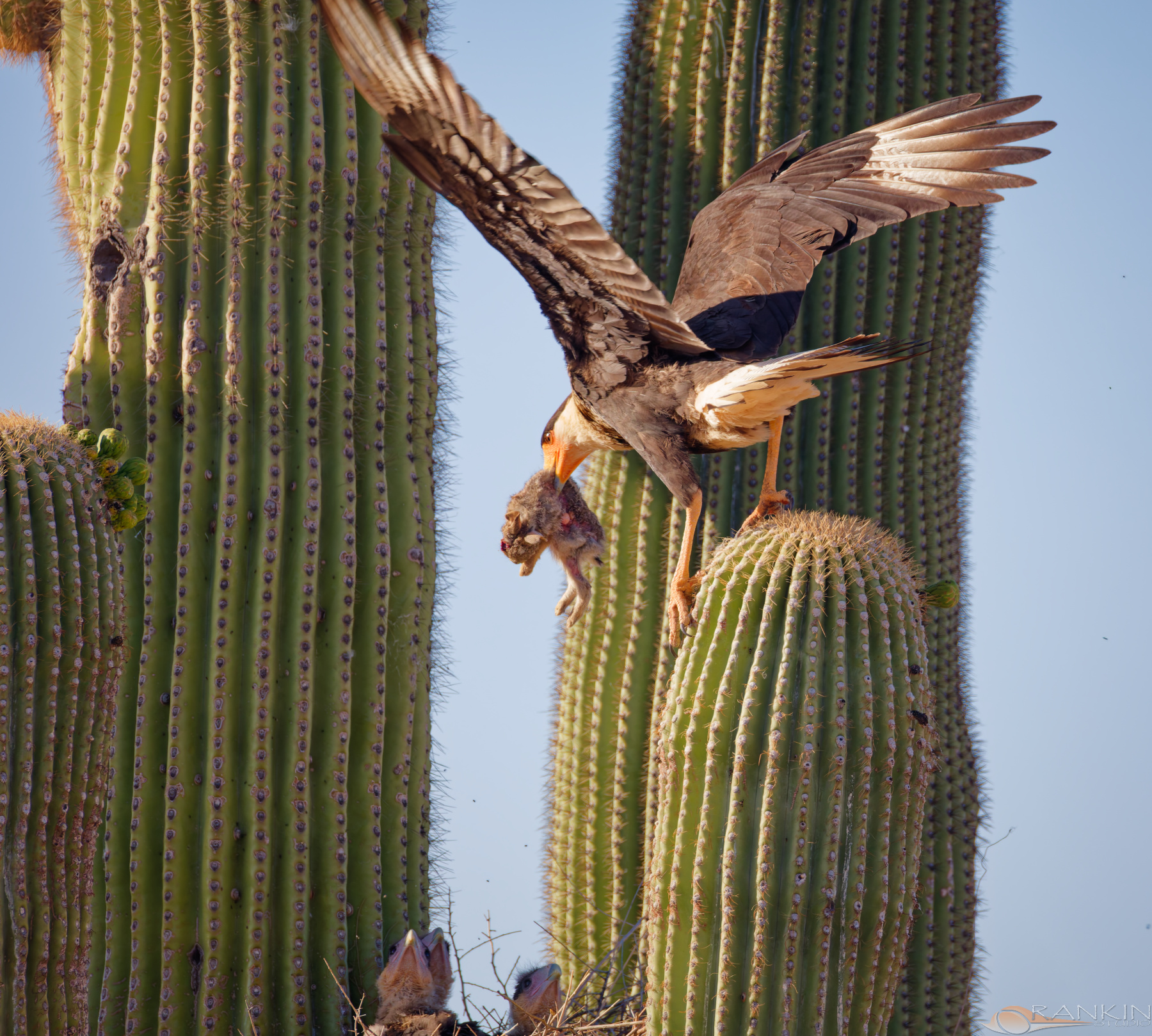 Crested Caracara Watched an adult Crested Caracara come in with a fresh rabbit kill and feed the young in the nest. Awesome sight. Return to Birds Gallery